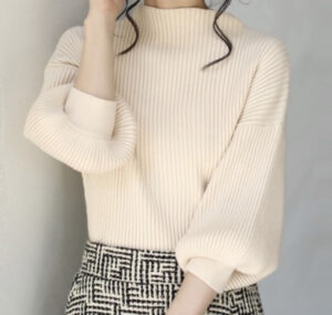 例えば、綺麗めデザインのセーターもリブ編みでカジュアルなイメージで。